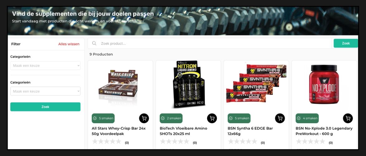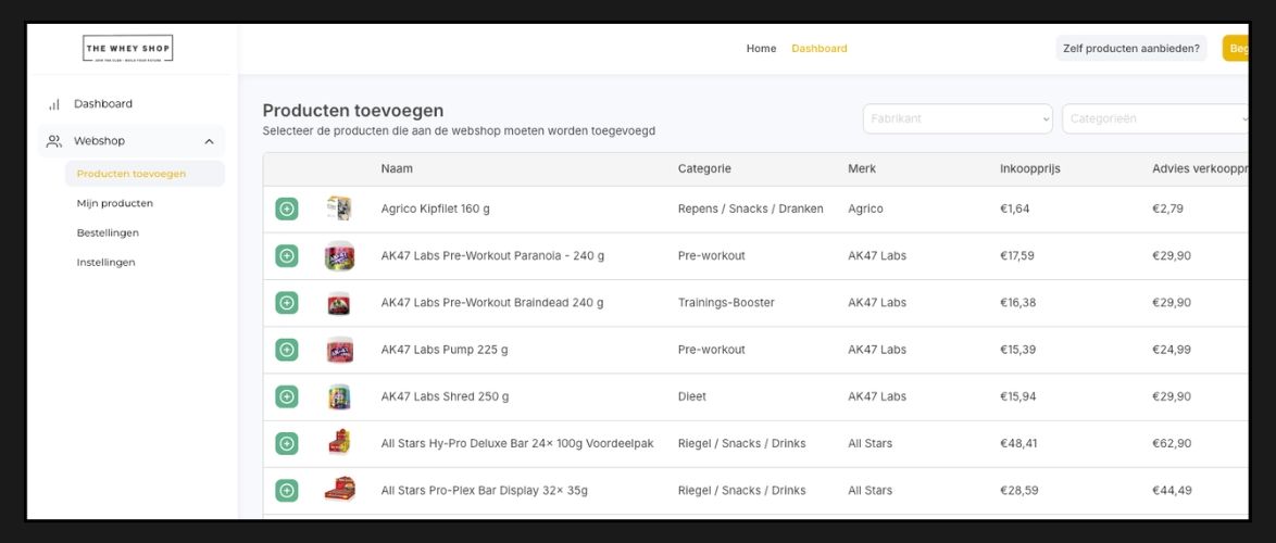 Selecteer eenvoudig uit duizenden producten van eiwitshakes tot sportaccessoires. Jij bepaalt wat in je webshop komt, zonder voorraad of inkoopkosten.